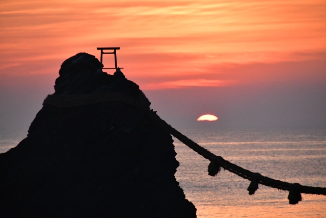 The Married Couple Rocks, two large rocks in the ocean connected by a shimenawa (sacred rope), represent the union of the creator gods Izanagi and Izanami. The larger rock symbolizes the husband, and the smaller, the wife, with the rope signifying the bonds of marriage. At high tide, the rocks and the torii gate perched atop the larger rock create a stunning view against the backdrop of the rising or setting sun, especially during the summer solstice.