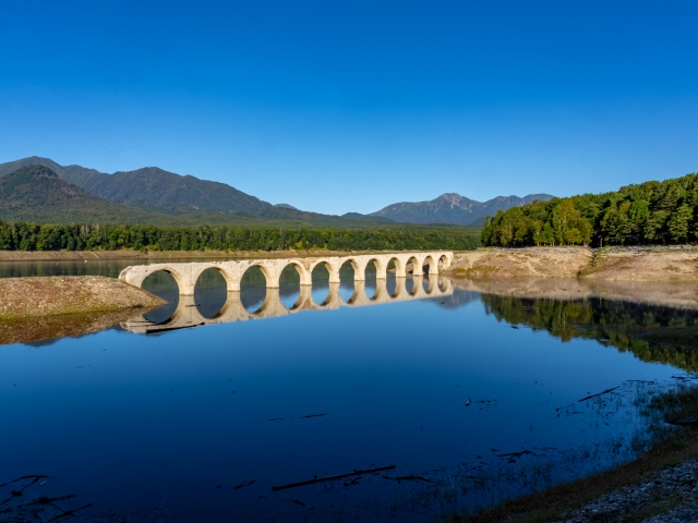 Lake Nukabira is an artificial lake famous for the Taushubetsu River Bridge, a historical arch bridge visible only during certain times of the year due to fluctuating water levels. This area offers excellent opportunities for canoeing, fishing, and snowshoeing in winter, alongside stunning views of the seasonal bridge.